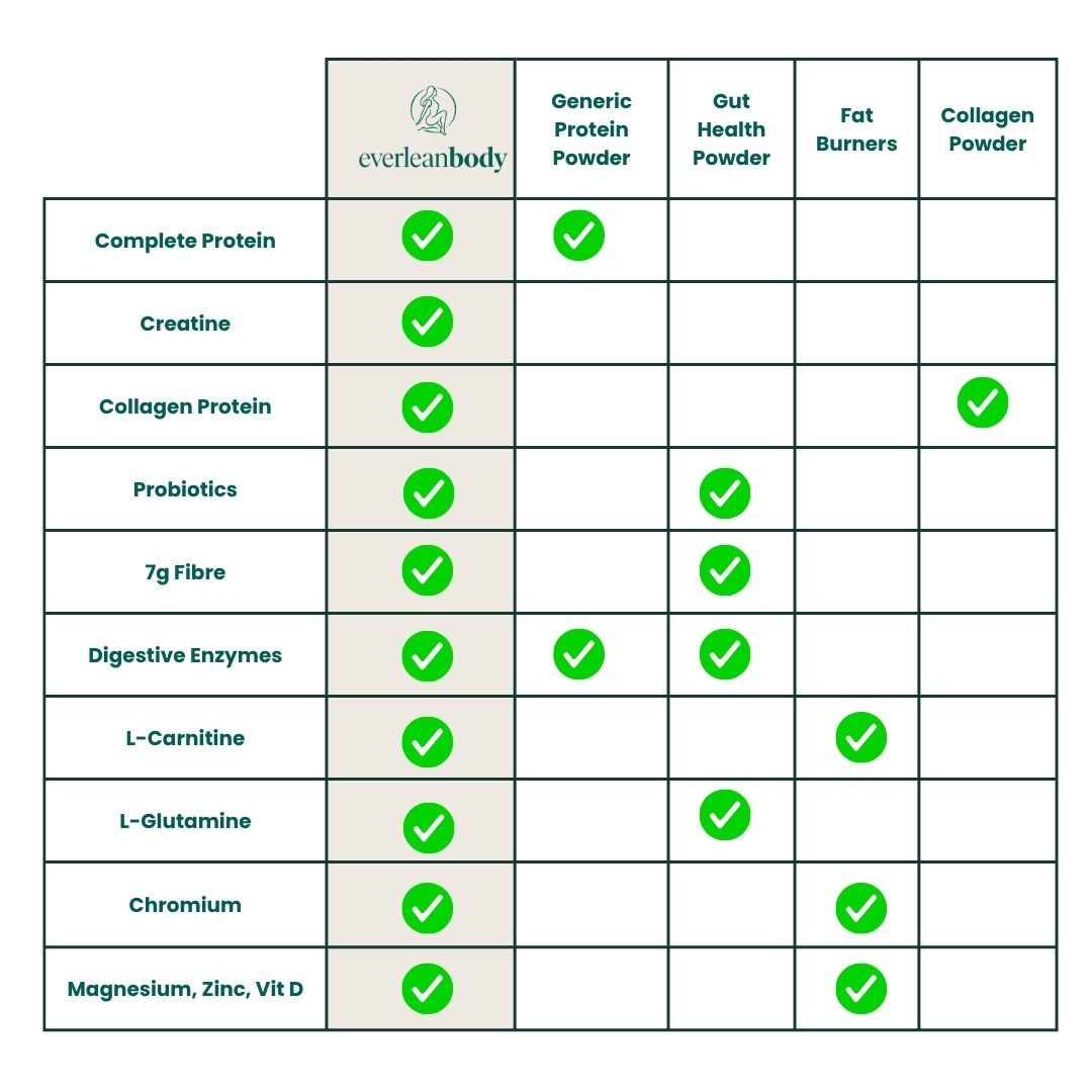 - Collagen, L glutamine, L carnitine, MCT, prebiotic fibre, probiotics and enzymes support digestion, reduce bloating and steady metabolism.